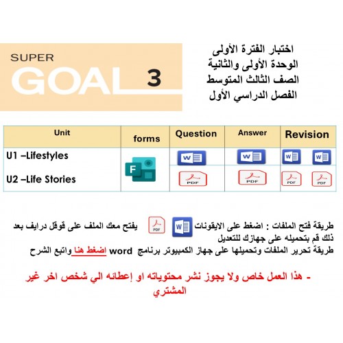 اختبار الفترة الأولى منهج Super Goal 3 - الوحدتين الأولى والثانية ( ورقي - Forms ) الفصل الدراسي الأول + المراجعة